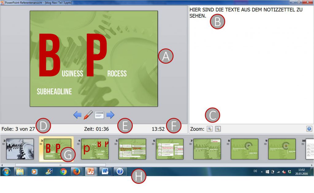 During your presentation, you might refer to something on which you aren’t 100% certain and need to look at your notes or other files. Presenter view helps. You can use Presenter view as a tool for navigation. In principle, it is important that you as the speaker can view features on the laptop while the audience continues to follow the projection.  You can use other applications during the presentation without viewers even noticing it.