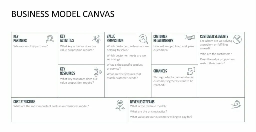 The Business Model Canvas was first introduced in 2004 by Dr. Alexander Osterwalder and Prof. Yves Pigneur. It is now one of the best-known and most popular tools for analyzing and visualizing business models. Unlike a linear business plan, the Business Model Canvas uses a dynamic set of test modules that facilitate a more detailed analysis. Fill them out one by one and get to the heart of your company’s structure and activities.
