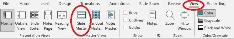 - Go to View > Slide Master, which is found in the Master Views group.