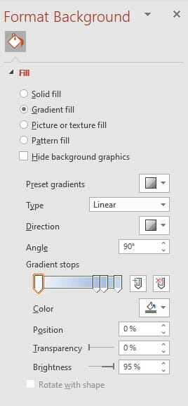 A gradient is a bit more elaborate than a monochromatic background. But don’t go overboard! The background should align with the rest of your presentation and never overwhelm your content. Set a color gradient as follows: