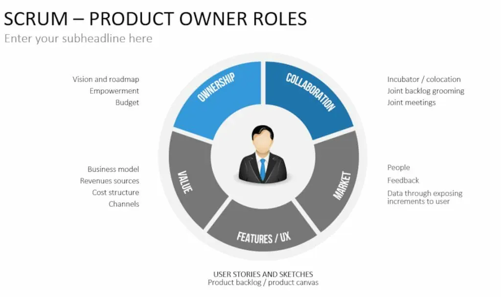 Product Owner: The Product Owner acts as a key figure in the team and has a clear vision of the goal. Using the Product Backlog, they convey this vision to the development team. The Product Backlog is a list of all the features, requirements, bug fixes, and enhancements of the product that are addressed in Scrum.
